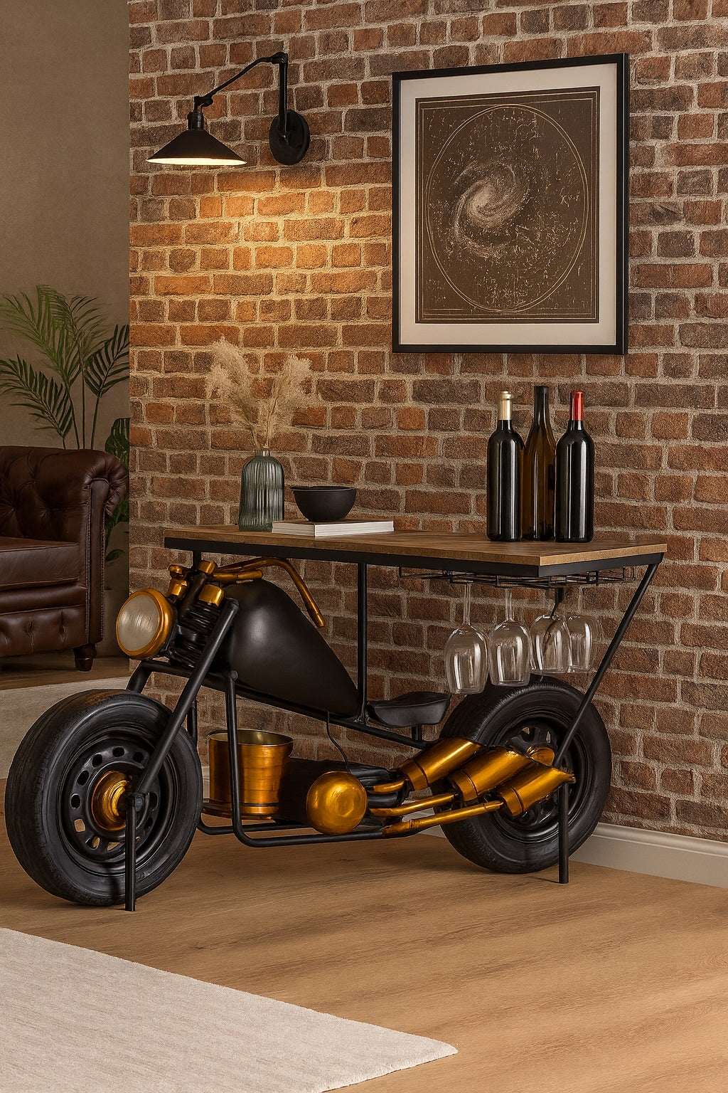 Vintage-inspired bike bar crafted from a classic motorcycle frame with black and gold detailing. A wooden countertop rests above integrated wine racks and hanging glass holders for functional flair. Bold and nostalgic, it transforms automotive heritage into a showstopping centerpiece for spirited gatherings.