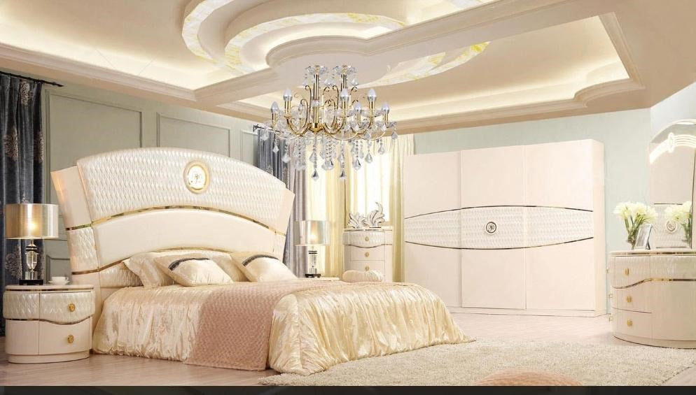 A luxurious bedroom suite in a light beige with a curved, upholstered headboard featuring a decorative gold-toned design dominates the centre. Matching nightstands flank the bed, each with two drawers and gold accents.