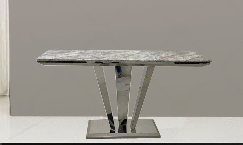 The console is made of a light grey stone , exhibiting a subtle, veined pattern.Its edges are smoothly finished.The table's legs are constructed from brushed stainless steel, forming a distinctive, elegant, and slightly triangular base. Three angled supports converge at the lower portion and taper up to connect with the tabletop. The base is streamlined square.