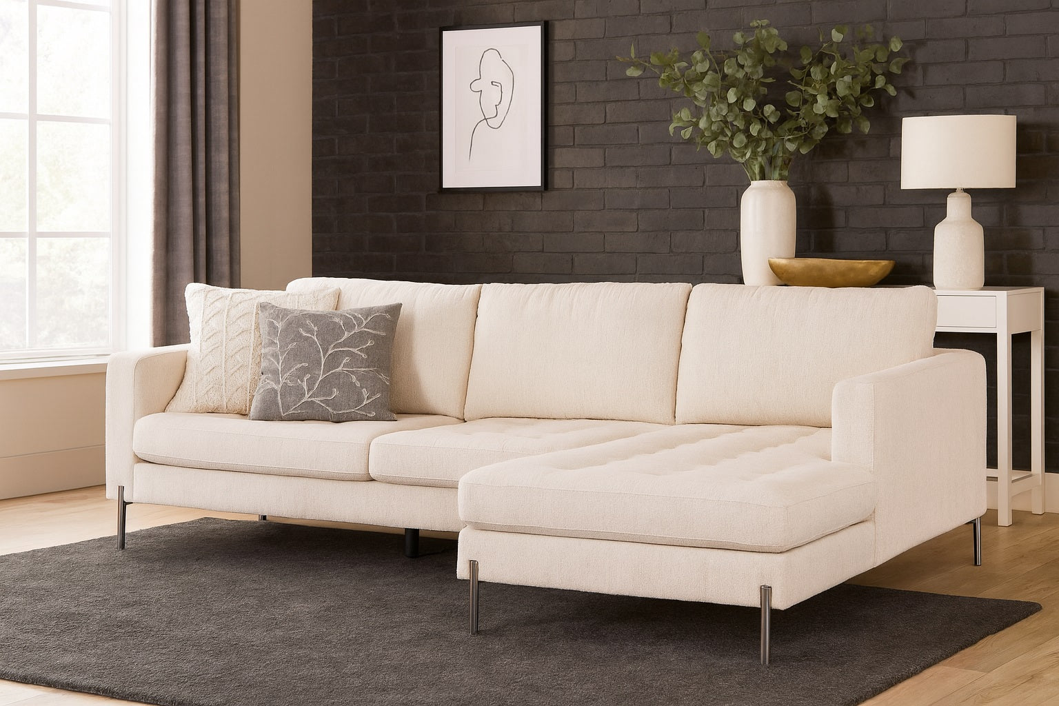 This elegant sectional sofa showcases a minimalist design with clean lines and upholstery that adds a soft, neutral touch to any living space. It features three generously sized back cushions and a tufted seat cushion on the chaise lounge, which extends to the right for added comfort and lounging versatility. The slim, metal legs lend a modern, airy feel while providing sturdy support. With its understated sophistication and functional layout, this piece is ideal for contemporary interiors seeking both style and relaxation.