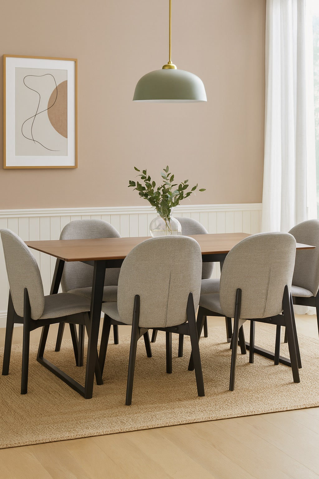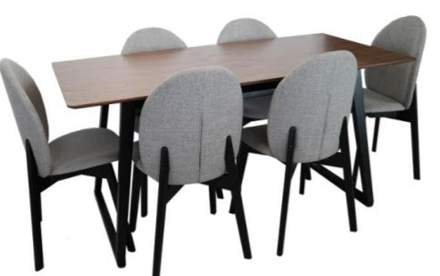 This dining set features a rectangular table with a walnut veneer top and solid rubberwood frame. Six chairs accompany it, each crafted with a rubberwood base and grey upholstered seat. The ensemble blends rich wood tones with soft fabric for a refined, modern dining experience.