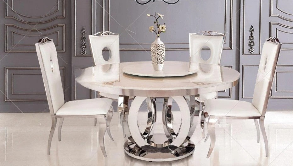 Round, marble-topped dining table in a cream color with subtle veining.The table's base is a complex, interwoven design of polished stainless steel, creating a circular pattern. White leather-upholstered chairs with chair backs that feature a sculpted, oval cutout. The chairs have a simple, elegant design with curved, stainless steel legs and decorative accents on the backrests.