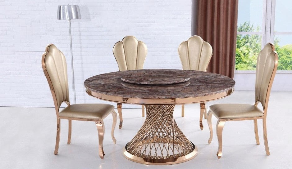 A round, light brownish-gray marble dining table with a rose gold metal base and frame. Matching dining chairs, upholstered in a cream coloured material,have a curved, shell like backrest and rose gold metal legs with decorative curves.