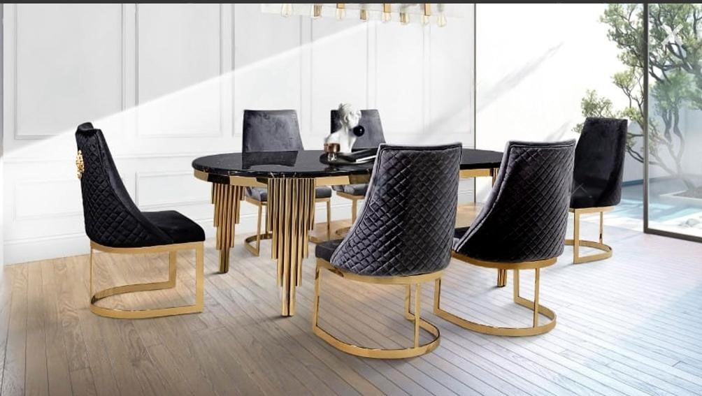 A dining set featuring an oval-shaped black glass top with a gold-toned metal base, designed for 6-8 people. The chairs have a black quilted velvet upholstery and gold-plated metal legs. The chairs have a gently sloping, curved backrest and a curved, continuous gold metal under-seat structure forming the chair's base. The table's legs feature tall, vertical, slender gold metal supports that taper down from a wide top piece to form a graceful base.