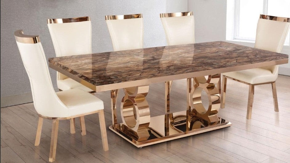 A rectangular dining table with a marble top and rose gold-colored metal legs and trim.The table has matching chairs with cream coloured upholstery and rose gold-colored metal frames and detailing. The marble table top features a mix of brown and light beige marble veining patterns. The chairs have curved backs and upholstered in cream coloured, smooth material.