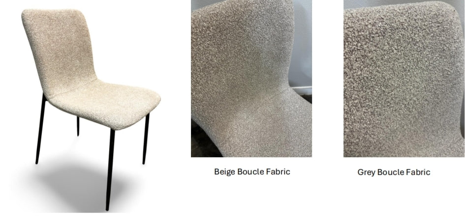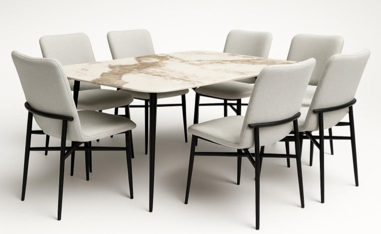 This 7-piece dining suite features a rectangular ceramic marble top table with a glossy marbled finish in tones of white and brown, offering a sleek and durable surface. It is paired with six upholstered chairs in soft boucle fabric, each supported by black legs that contrast elegantly with the table’s polished look. The ensemble blends contemporary materials and textures for a stylish, modern dining experience.