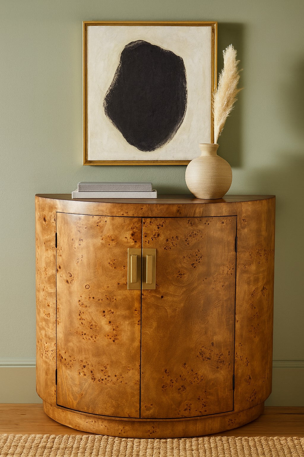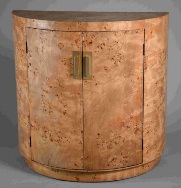 The sideboard features a smooth semi‑circular silhouette crafted from richly figured burl wood. Its twin doors are fitted with slim vertical brass handles that add a refined contrast. The overall look is elegant and sculptural, making it a standout piece in a sophisticated interior.