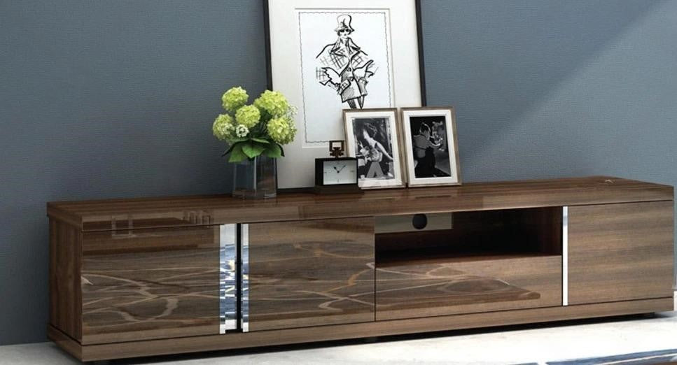 A dark-brown, modern TV stand features a glossy, high-sheen finish, with a subtle wood grain pattern. Two cabinet doors are visible, flanking a central drawer. Vertical, thin strips of polished metal or chrome accent the sides of the cabinet doors and drawer.