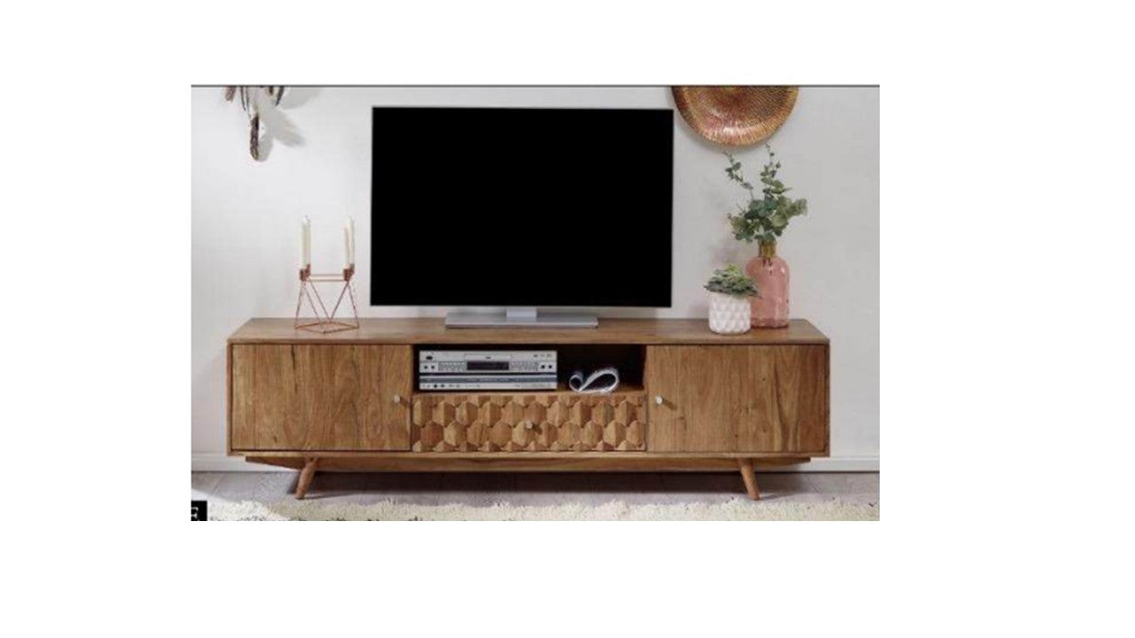 This media unit features mango wood construction, perfect for organizing electronics with style.