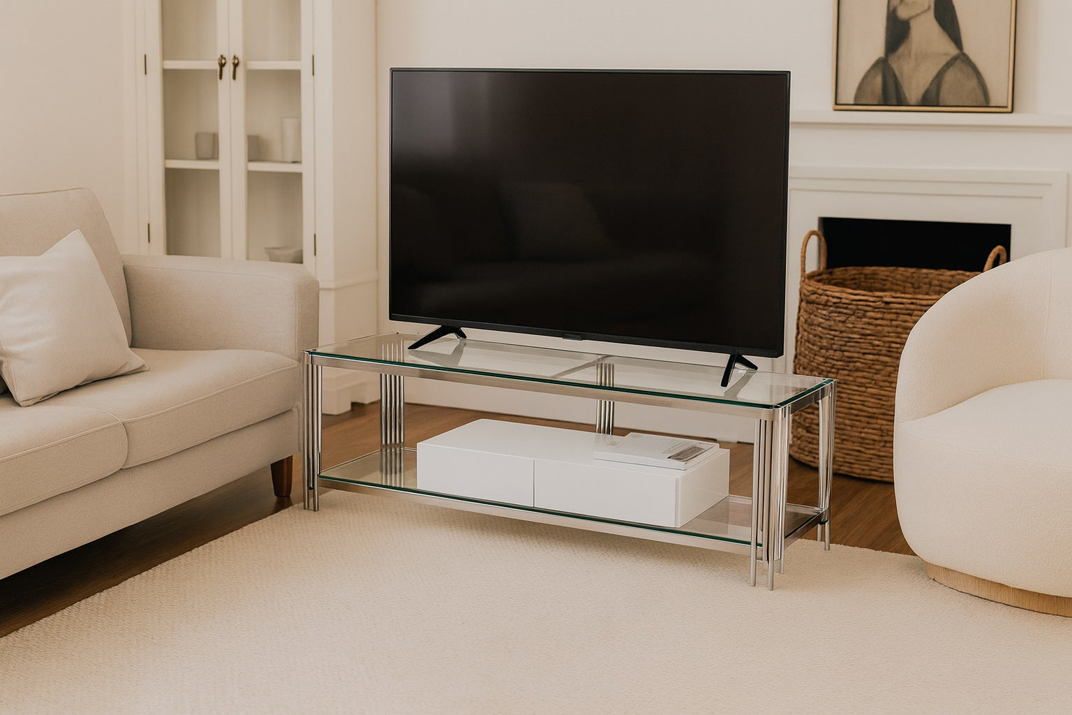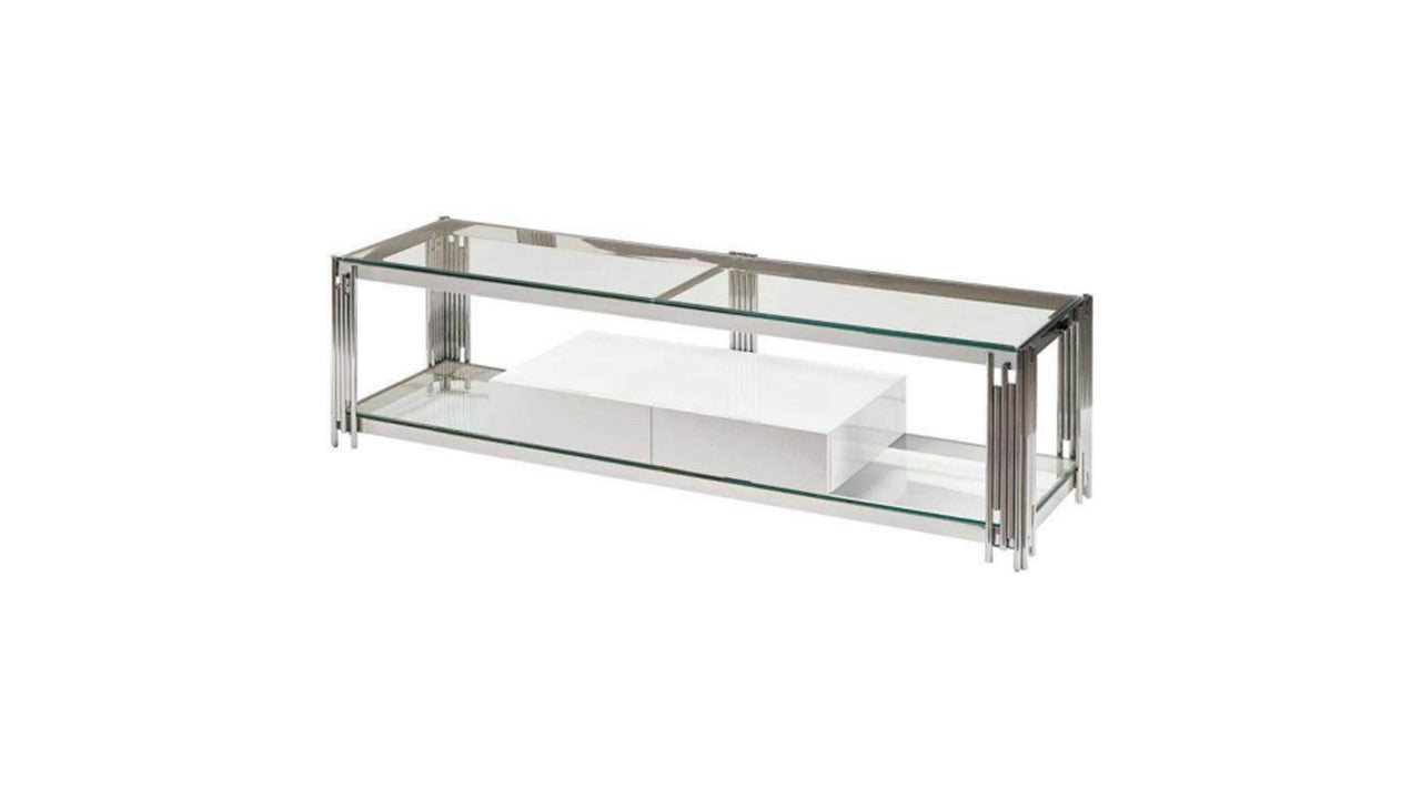 A plasma table with stainless steel and clear glass, designed for contemporary spaces.