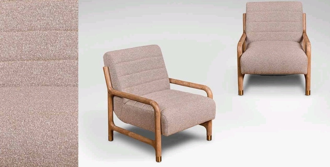 Light taupe fabric coloured armchairs in a light-coloured wood frame with smooth,curved armrests and legs. The seat and back cushions are upholstered in a textured fabric with subtle vertical lines/ridges, appearing slightly nubby or woven.