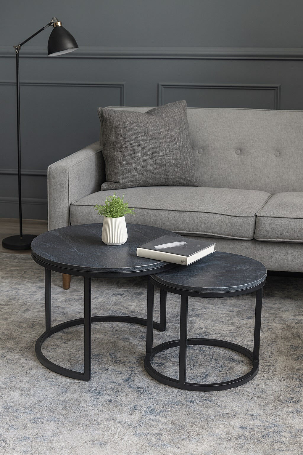 Two side tables with solid marble tops and metal bases, combining elegance and stability.