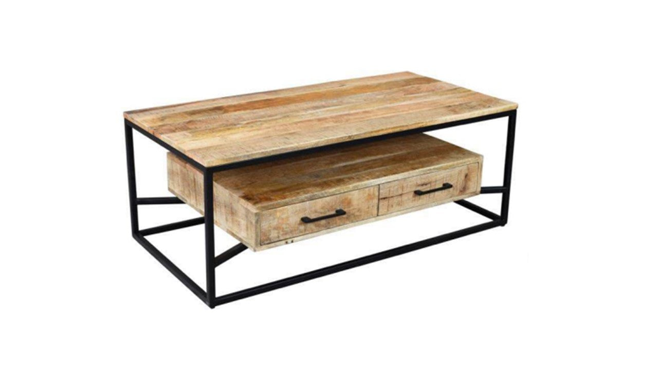 This coffee table blends solid wood with a sleek metal frame, creating a harmonious balance of warmth and industrial style. The spacious tabletop and lower shelf provide ample space for books, trays, and decorative items.