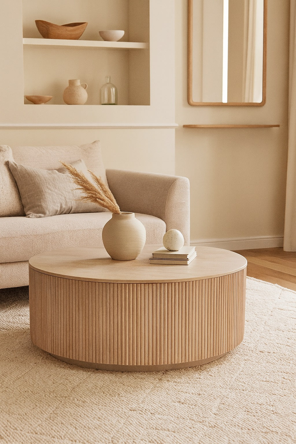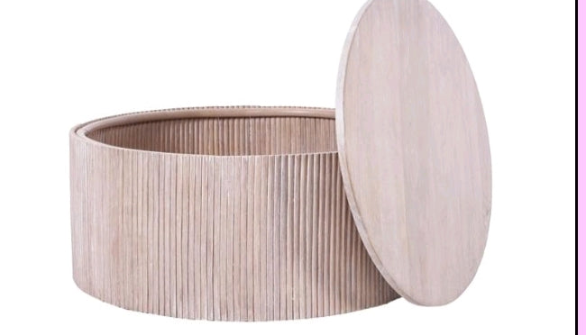 Round coffee table with vertical grooves and a matching lid for concealed storage. Light wood finish and minimalist form offer a rustic, sculptural accent. Ideal for compact spaces where function meets understated design.