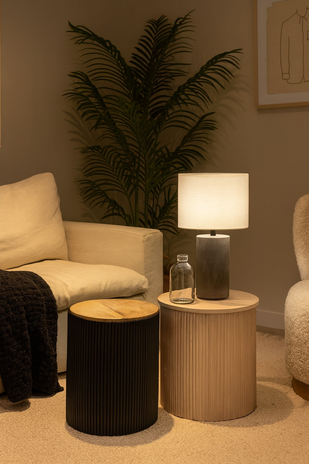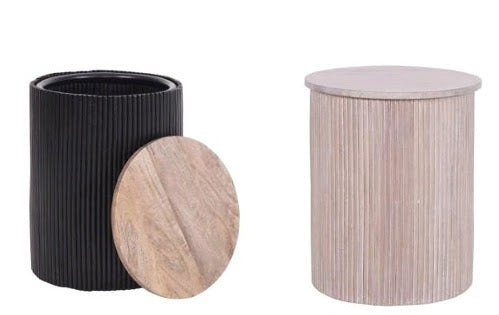 Cylindrical lamp table duo with vertical ridges and removable wood lids for hidden storage. Contrasting black and natural finishes add sculptural depth to modern interiors. Functional as accent tables, storage units, or decorative companions beside seating.