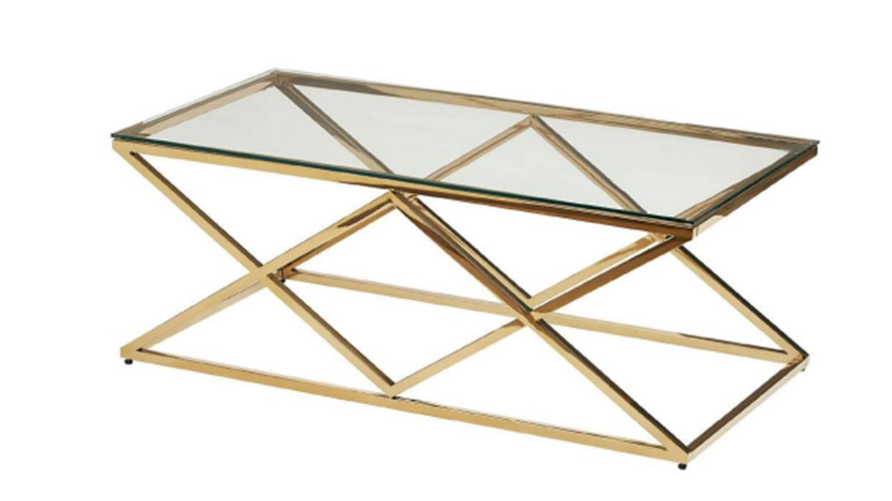 A glamorous coffee table with gold accents and a clear glass top, bringing a touch of luxury to any room.