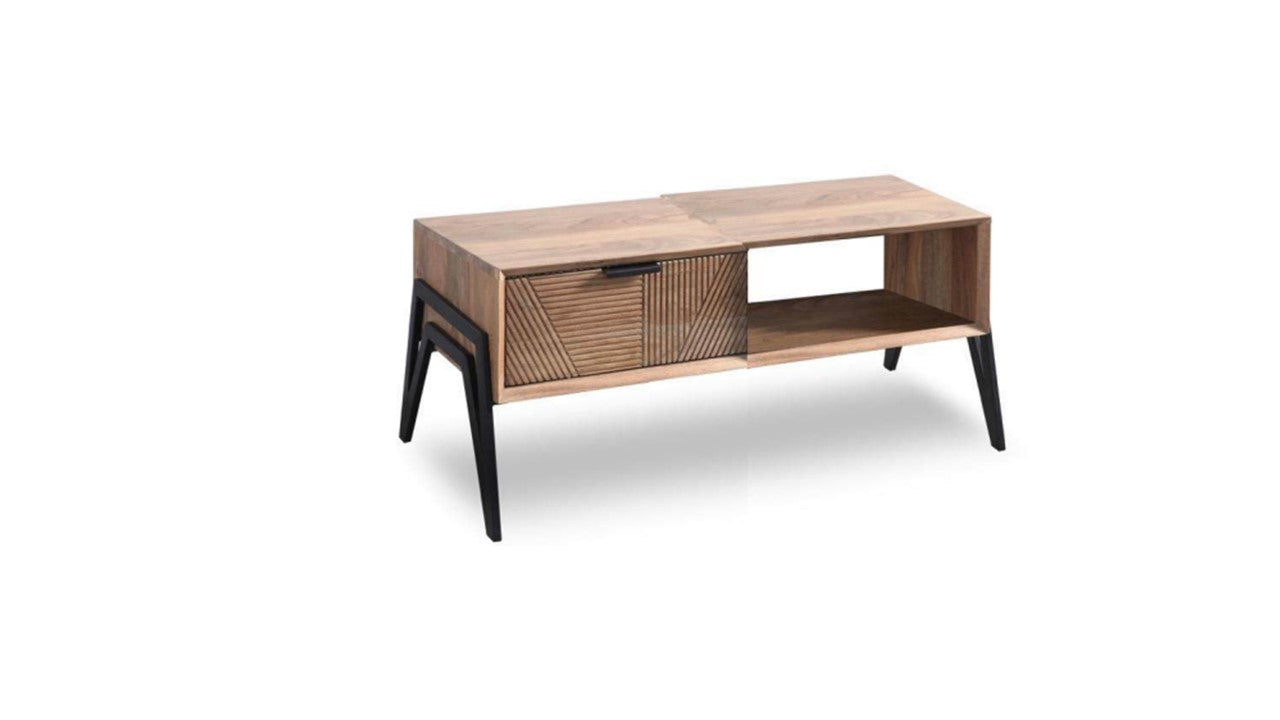 A coffee table featuring acacia wood and a convenient drawer for everyday essentials.
