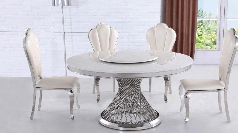A round, white marble dining table with a stainless steel base. The table's base is a twisted, open, stainless steel lattice. Cream coloured dining chairs with stainless steel legs and a shell shaped back rest surround the table. The chairs have a classic, slightly ornate design.