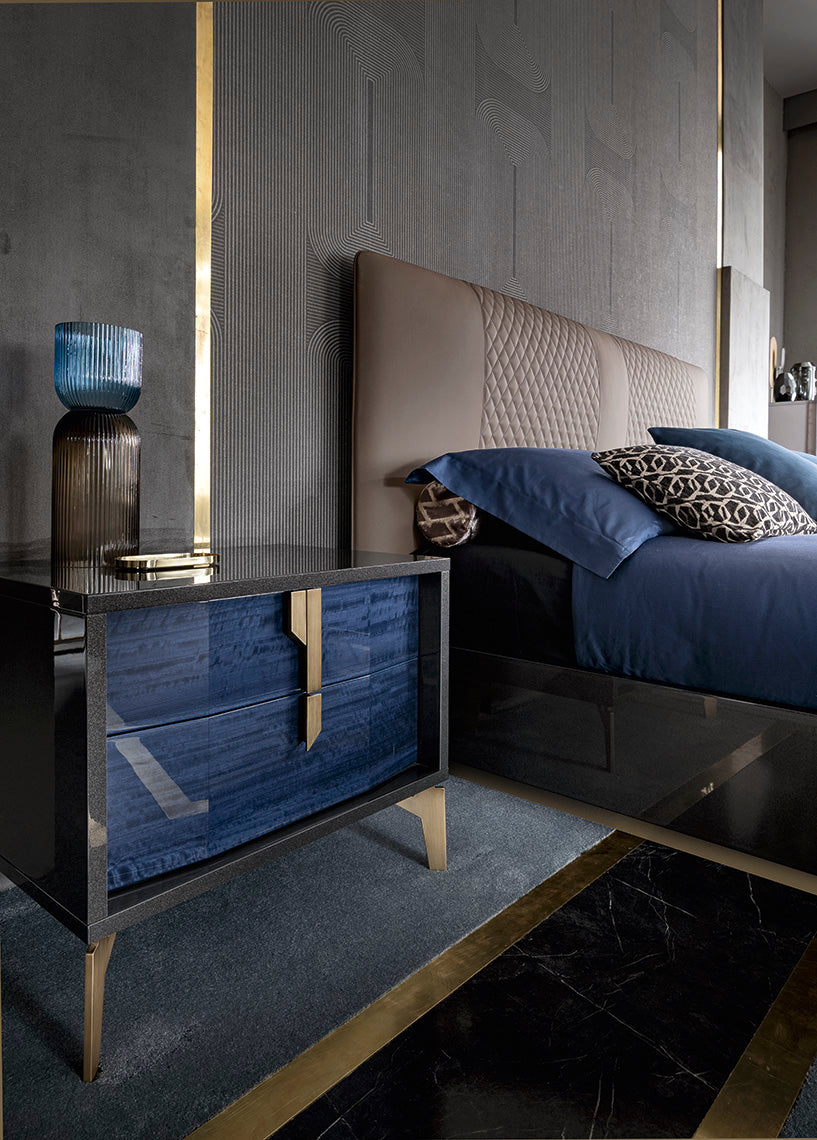 The dresser features a glossy dark surface paired with deep blue drawers, creating a bold, modern aesthetic. Each drawer is accented with sleek gold handles that add a touch of luxury. Its clean-lined structure and low profile emphasize contemporary elegance and functional design.